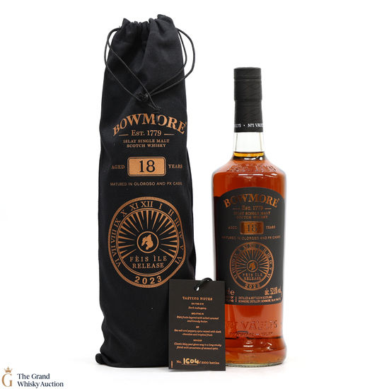 This is the Feis Ile 2023 release from Bowmore Distillery. Matured in Oloroso & PX casks for 18 years, this single malt was bottled at 52.8% ABV. This rare annual release from Bowmore is limited to just 3500 bottles.