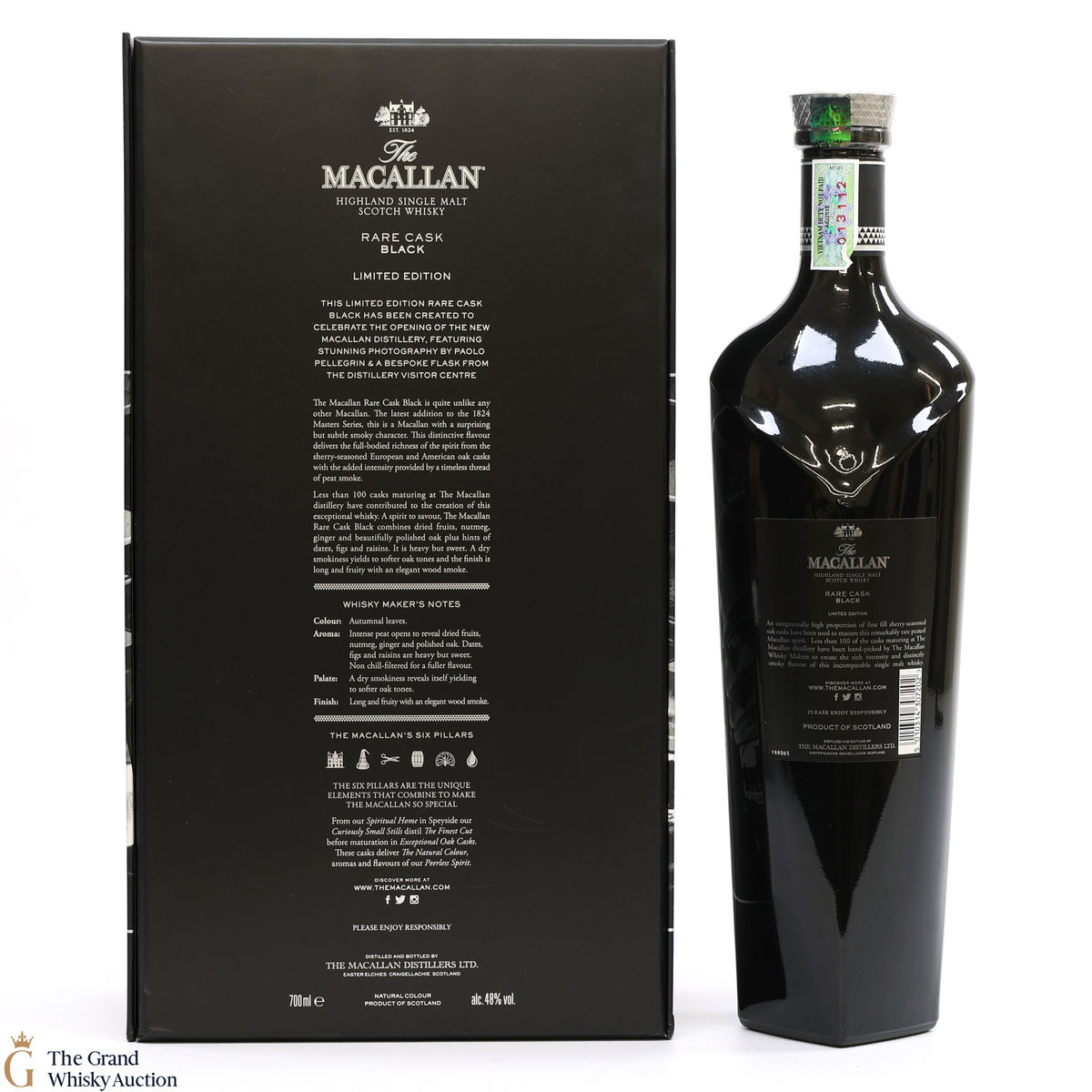 The Macallan Rare Cask Black Limited Edition was released to celebrate the opening of the new Macallan Distillery. It is part of the Macallan 1824 series and features stunning photography by Paolo Pellegrin and a bespoke flask from the Distillery Visitor Centre. The release was a limited edition of 7000 sets, which were only available at airports.