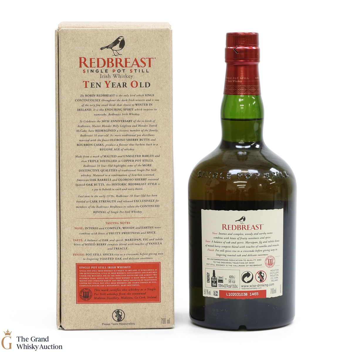 Redbreast 10 Year Old is a Bird House Exclusive bottling to celebrate the 30th anniversary of the re-birth of the Redbreast. Matured in a combination of bourbon-seasoned American oak barrels and Oloroso sherry seasoned Spanish oak butts before being bottled at a cask strength of 59.1% ABV is from batch 1.
