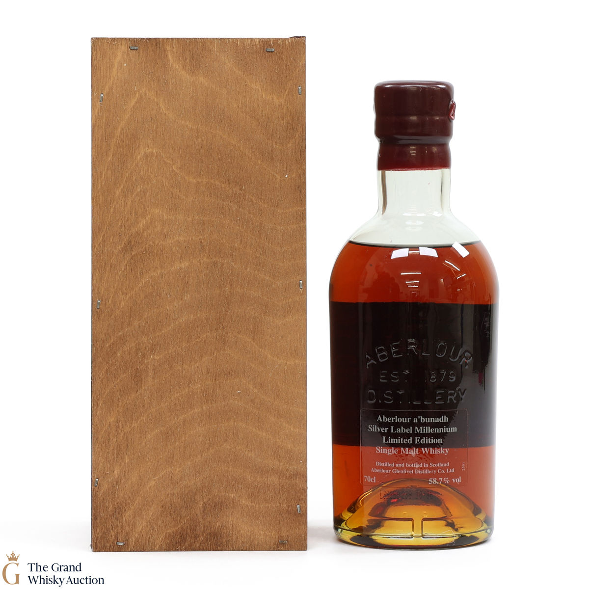Release for the Millenium, this is a rare bottle of Aberlour A'bunadh Silver Label Millenium limited-edition single malt whisky. This was aged in sherry butts for 12 years and bottled at cask strength. The label is made of 0.925 Sterling Silver.