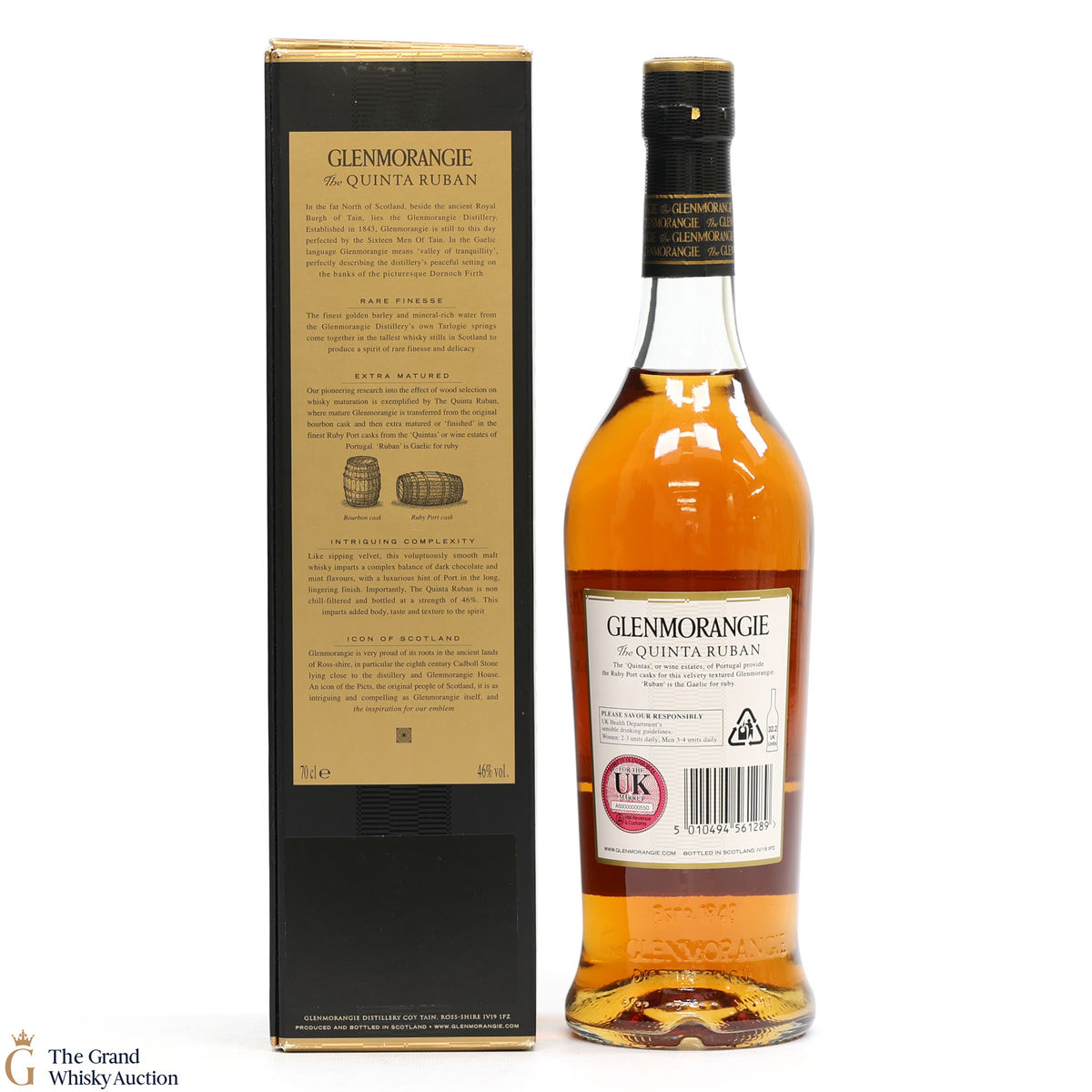 Glenmorangie Quinta Ruban is matured in bourbon casks before finishing in the finest Ruby Port casks from the "Quintas" or wine estates of Portugal. Ruban is Gaelic for Ruby.