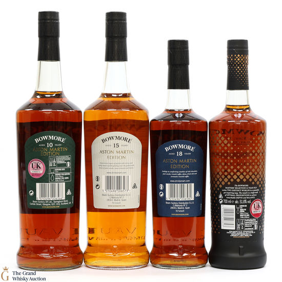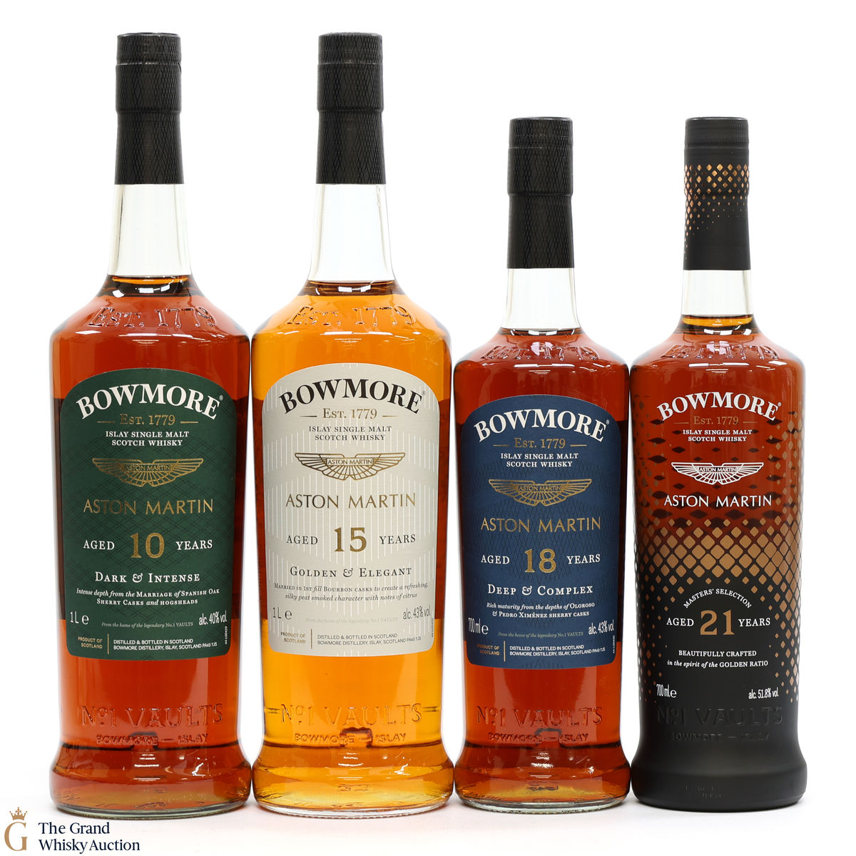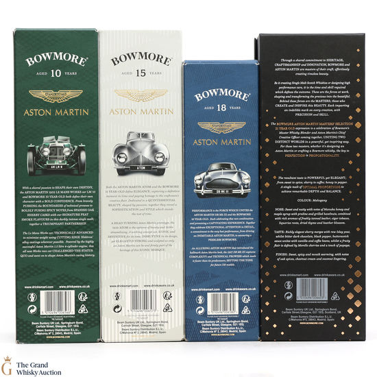 The full collection of the collaboration between Bowmore and Aston Martin, both creating timeless beauty and a lasting legacy. Each edition of the Aston Martin collection features a different car. Included in this lot is edition 1, 2, 3 & 21 YO:
