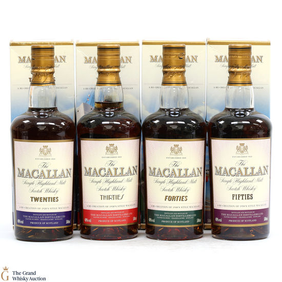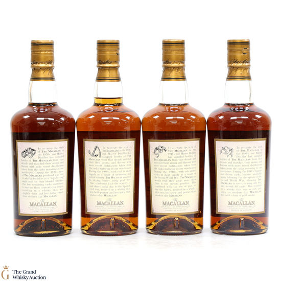 This lot includes a full set of the Macallan Travel Series: 1920s, 1930s 1940s & 1950s, each in their presentation boxes. 4 x 50cl.