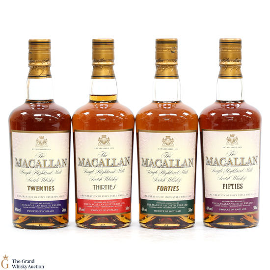 - Macallan - 1920s: Inspired by a 1920s Macallan and is the first edition of four in the travel series that was released in 2004. Most of the Macallan in the 1920s was produced and sold to whisky blenders as top dressing single malt for their blended whiskies. The remaining casks continued to mature for longer, resulting in a whisky that was drier and less toffee-sweet than Macallan today. 40% ABV, 50cl.