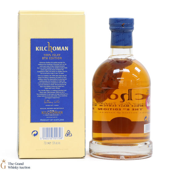 This is the 8th edition of Kilchoman's very popular 100% Islay series, released in 2018. This is a lightly peated single malt Scotch whisky (even compared with their Machir Bay and Loch Gorm), made with barley which was grown on Islay. It was distilled by Kilchoman is a batting of 23 bourbon barrels and 7 oloroso sherry butts filled between 2008 & 2012. It was bottled without chill-filtration or additional colours. This is a batch of just 12,000 bottles.