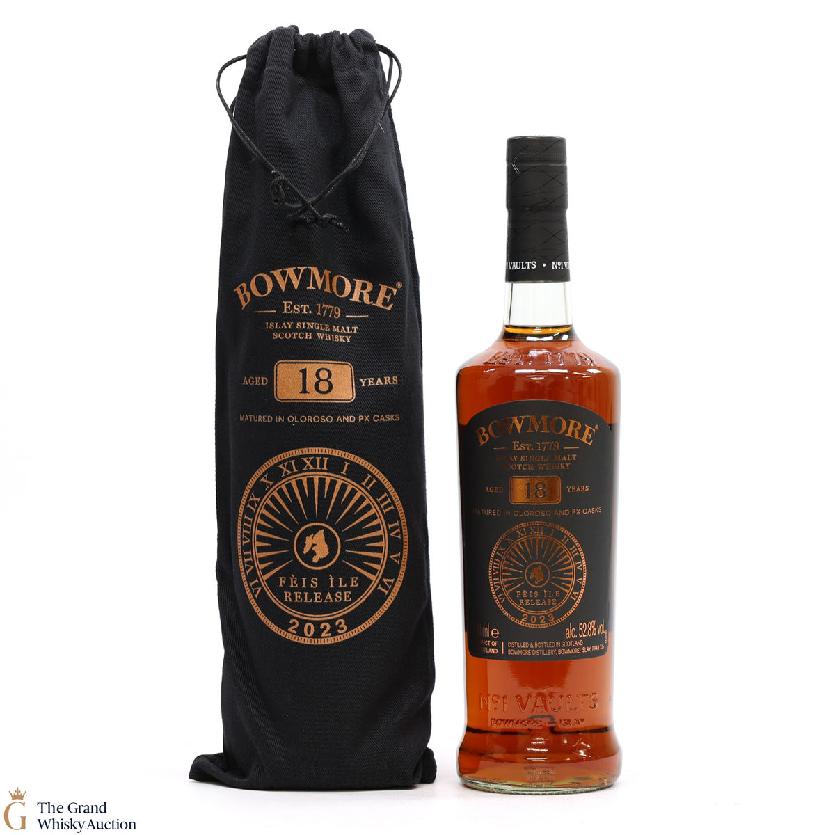 This is the Feis Ile 2023 release from Bowmore Distillery. Matured in Oloroso & PX casks for 18 years, this single malt was bottled at 52.8% ABV. This rare annual release from Bowmore is limited to just 3500 bottles.