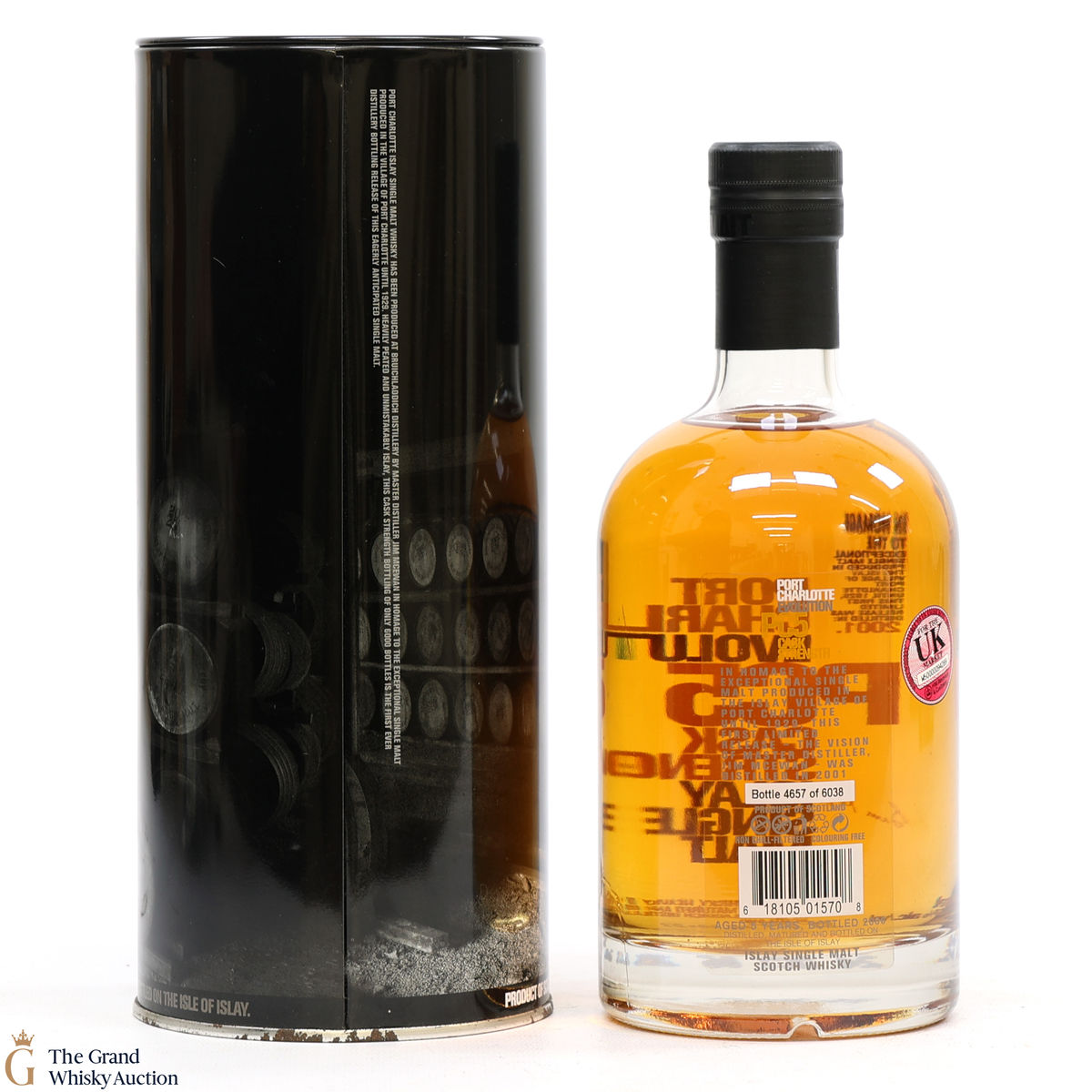 Port Charlotte PC5, produced by Bruichladdich Distillery, is a heavily peated spirit. It was the first release of heavily peated Port Charlotte and was produced in 2001 from some of the first spirits to be produced after the distillery's reopening. The single malt was bottled at 5 years old in 2006 and was limited to 6038 bottles.