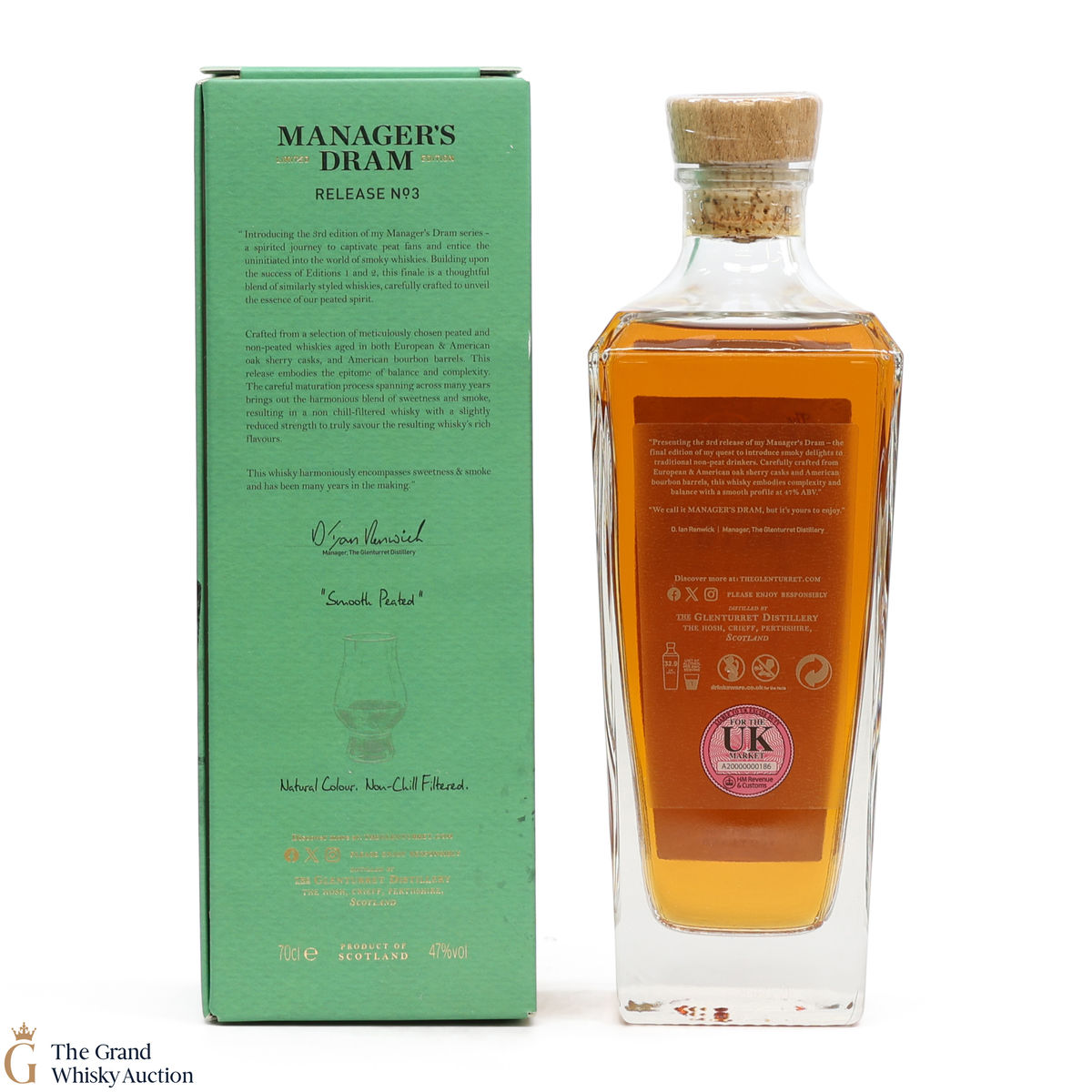 The Glenturret Manager's Dram - Release 3 is described as smooth peated and matured in Ex-Bourbon & Sherry casks before being bottled in 2023.