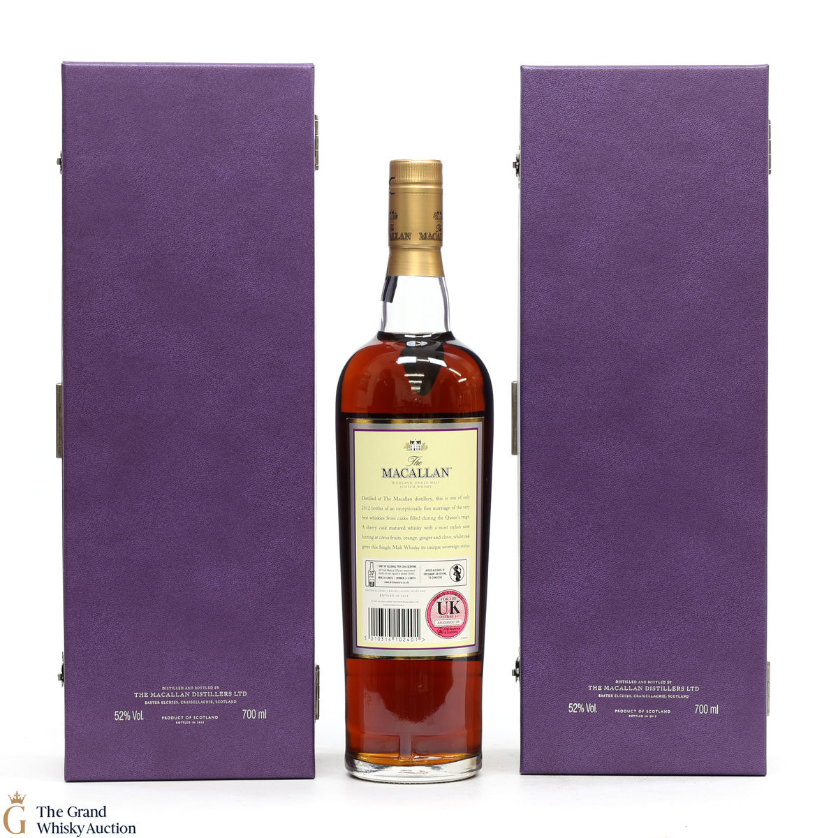 A highly desirable, limited-edition release from Macallan to commemorate the Golden Jubilee of Her Majesty Queen Elizabeth II (1952-2012). This is one of 2012 bottles. Drawn from its cask on the 8th of February 2012, by no coincidence the date of Her Majesty’s accession, this sherry cask-matured expression was bottled at 52% ABV. It is an instant classic and highly collectible.