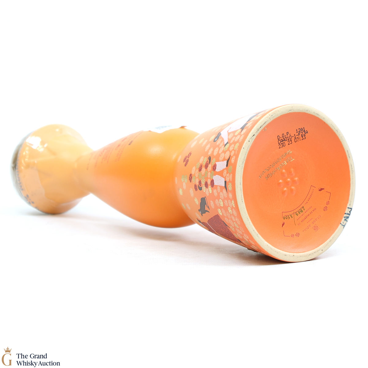 The decanter for this edition brims with a beautiful marigold-coloured glaze that deepens in shade as it reaches the base. The back of the piece has been decorated with a dreamlike illustration depicting a plentiful harvest, where masked figures rejoice in a miraculous bounty of flowers. On the front an intricately handcrafted, gold-plated ornament encases flowing arrangement of delicate cempasúchil petals.