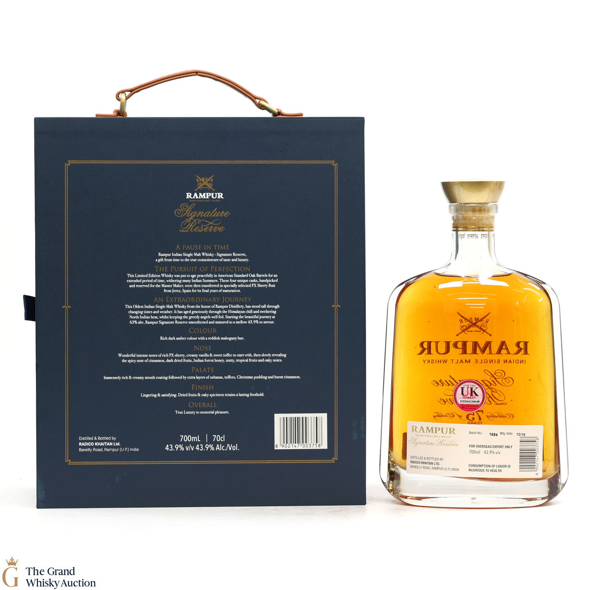 This Single Malt comes from the Rampur Distillery in India. This is their Signature Reserve which has matured in cask #1292 prior to being bottled at a cask strength of 43.9% ABV.
