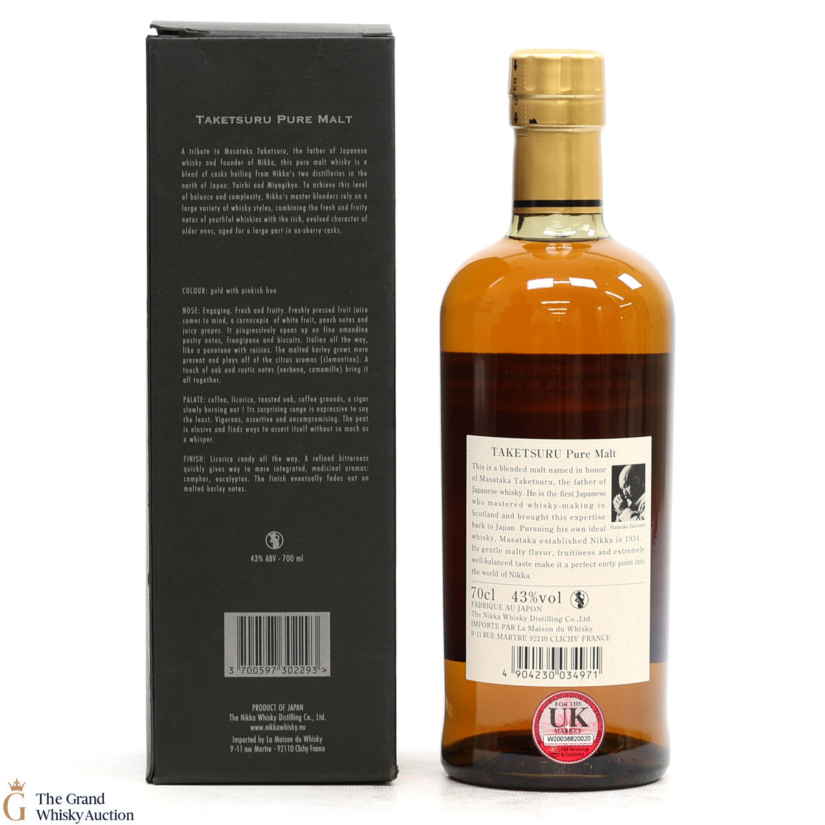 This is a non-age-statement expression of Nikka Taketsuru pure malt whisky, named after the company's founder, Masataka Taketsuru. It contains a blend consisting of a high percentage of malt from the Miyagikyo distillery, with the remainder coming from Yoichi, including some matured in sherry casks.