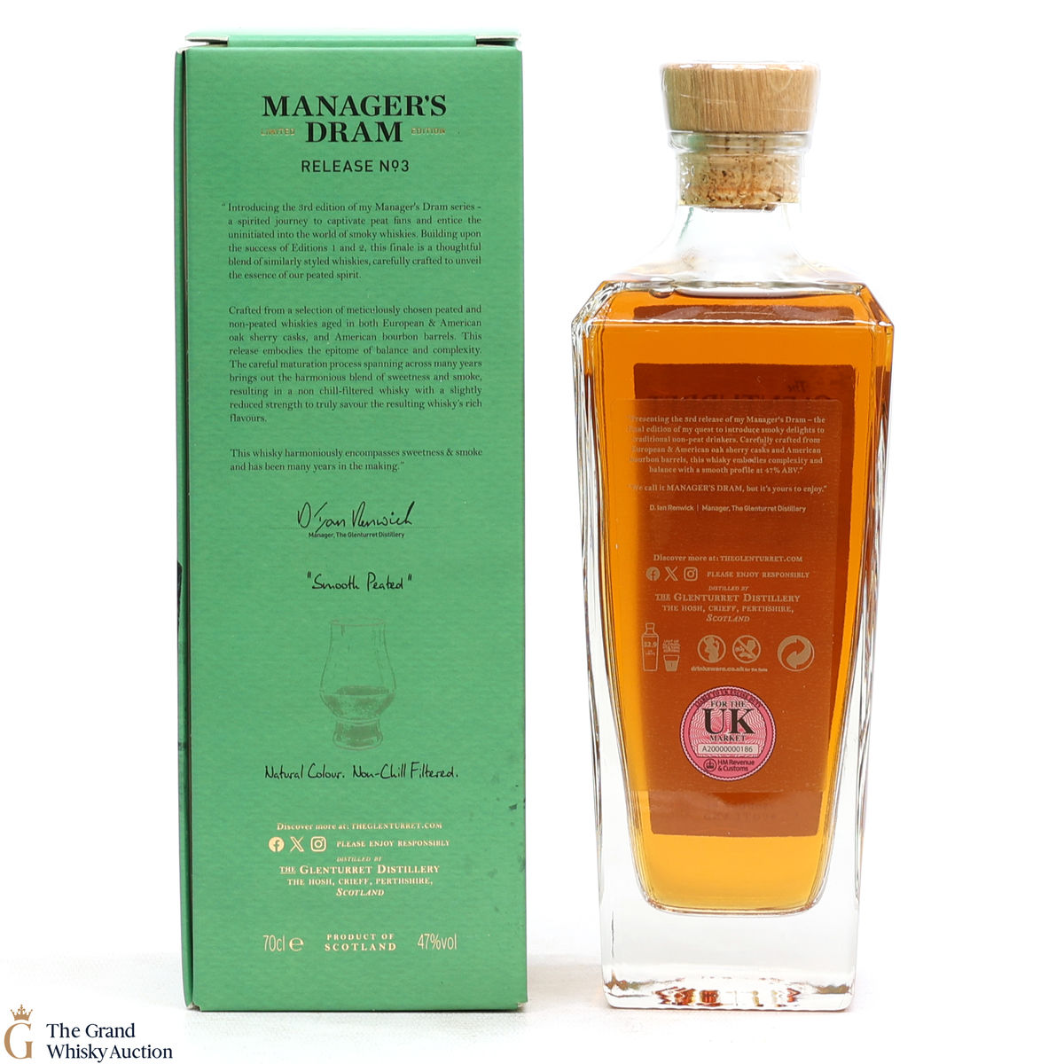 The Glenturret Manager's Dram - Release 3 is described as smooth peated and matured in Ex-Bourbon & Sherry casks before being bottled in 2023.