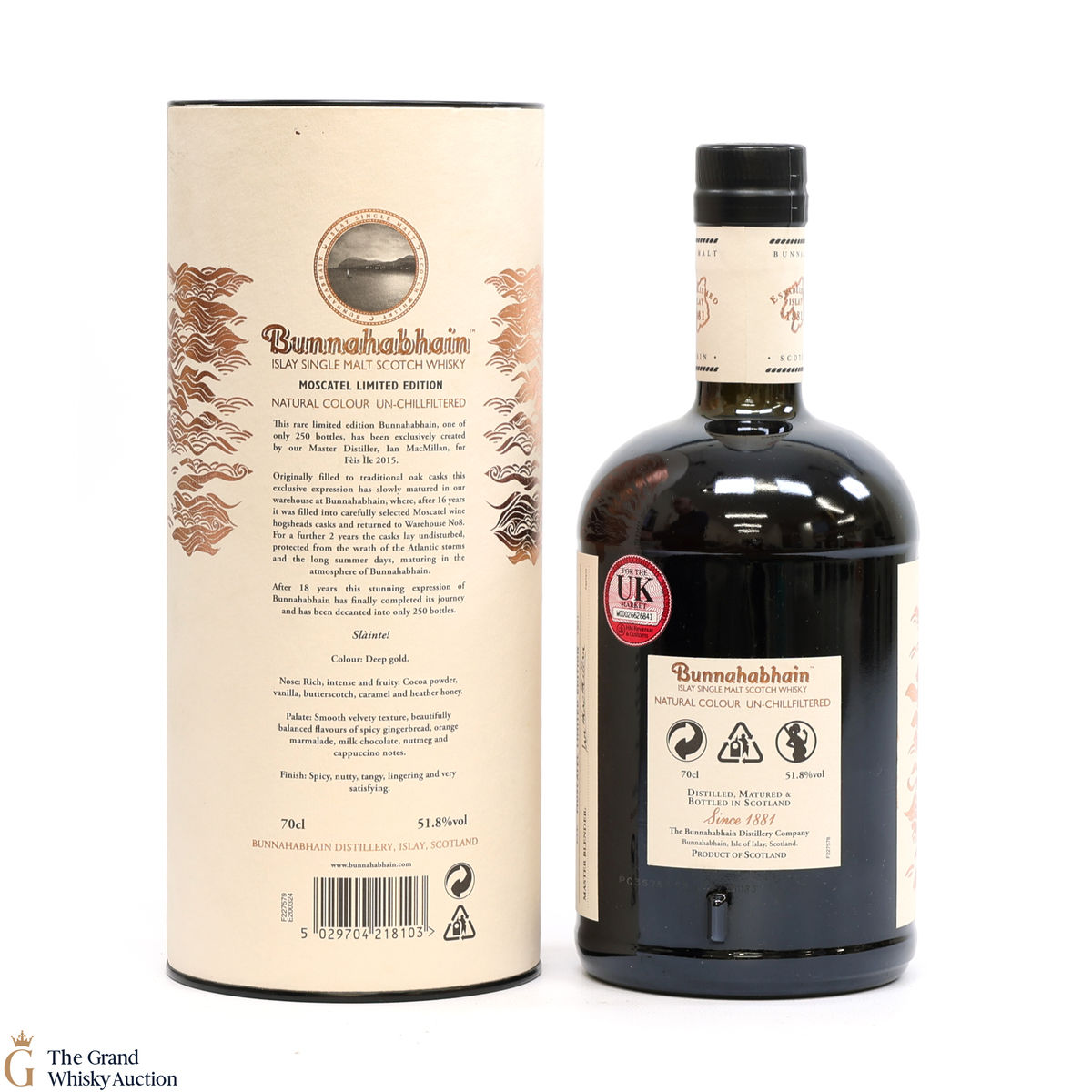 Originally filled to traditional oak casks this exclusive expression has slowly matured in the warehouse at Bunnahabhain, where, after 16 years it was filled into carefully selected Moscatel wine hogsheads casks and returned to Warehouse No8. For a further 2 years the casks lay undisturbed, protected from the wrath of Atlantic storms and the long summer days. After 18 years this stunning expression has finally completed its journey and was decanted into only 250 bottles.