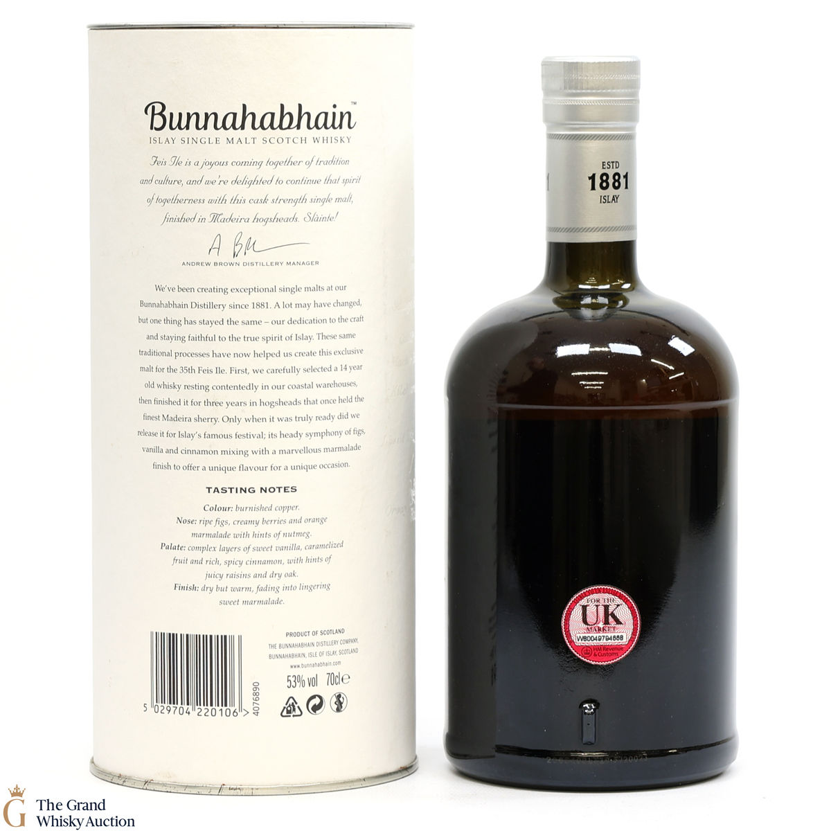This limited edition single malt from Bunnahabhain Distillery was matured for 14 years in classic bourbon barrels, then finished in Madeira casks for another three years. Bottled at 53%, and released by Bunnahabhain for the 25th anniversary of Fèis Ìle - Fèis Ìle 2020. This is one of only 1164 bottles produced.