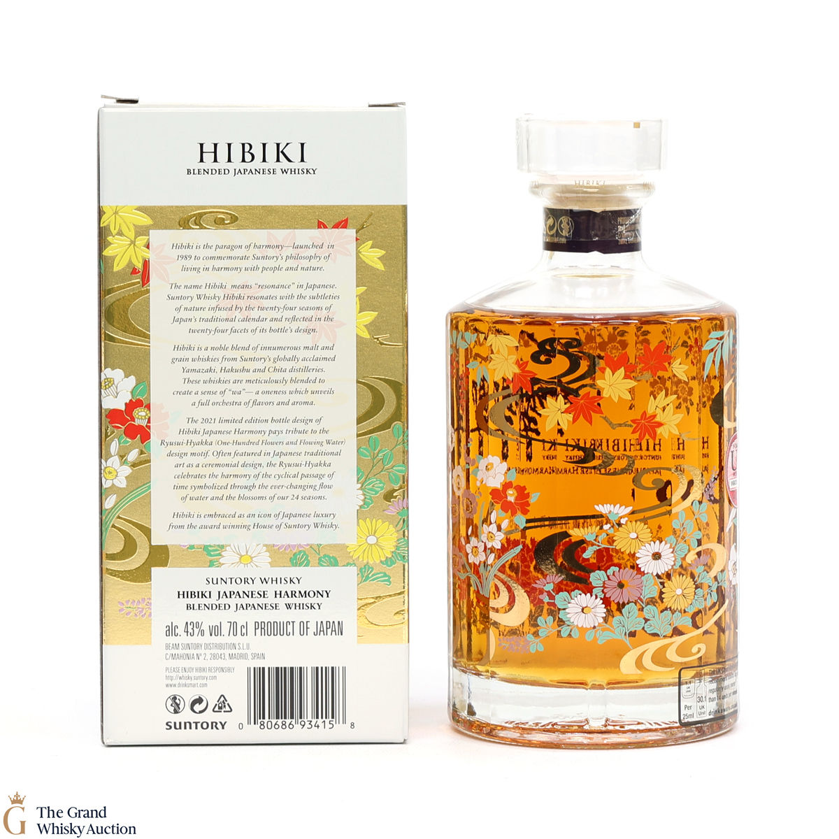 This is a limited edition, specially designed bottle with painted flowers and flowing ribbons of water. The 2021 special edition pays homage to the Ryisui-Hyakka (One Hundred Flowers and Flowing Water) and celebrates different seasonal flowers which help characterise the Japanese seasons. 5 types of casks were used and in typical Hibiki fashion, the bottle always has 24 facets which represent 24 seasons in the Japanese lunar calendar.