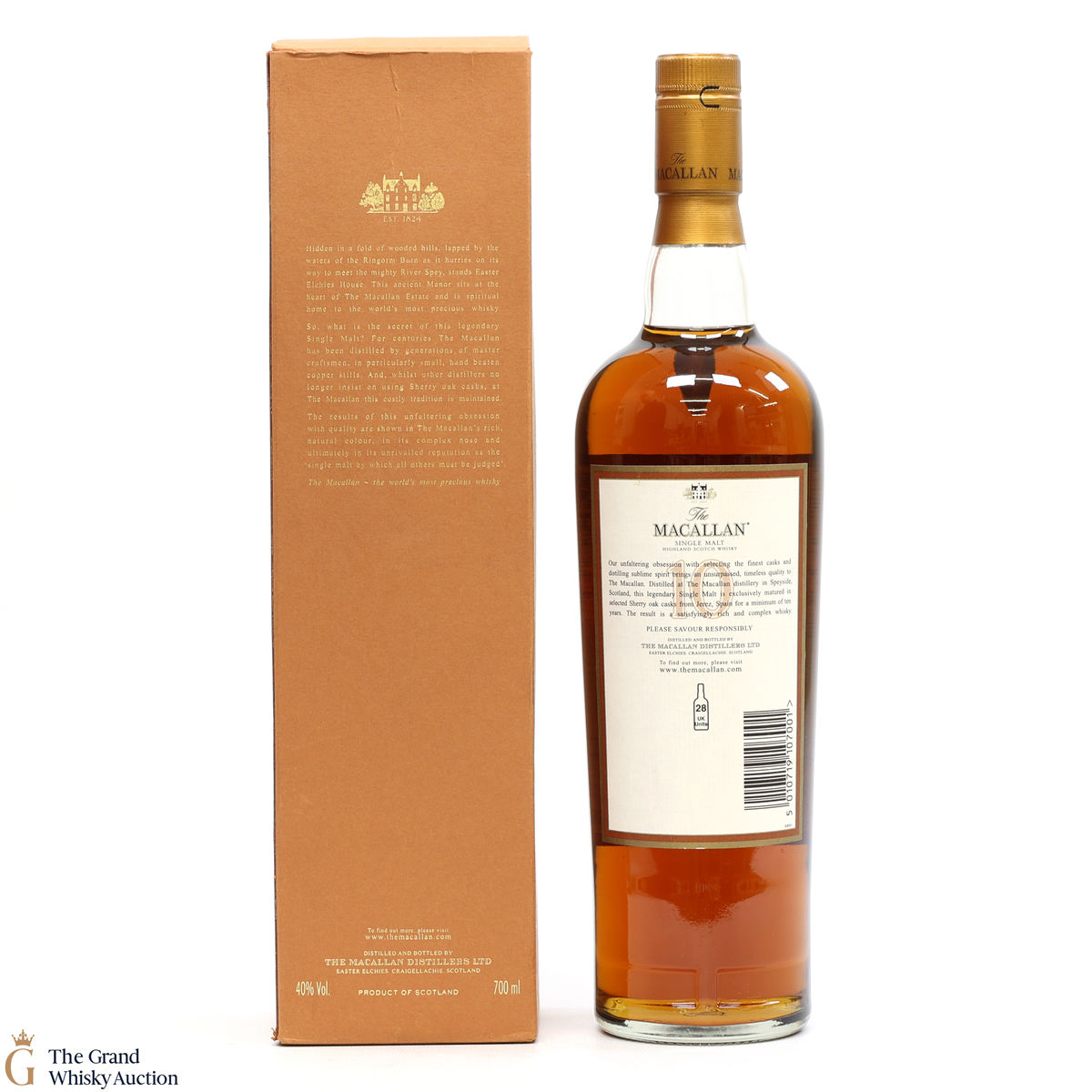 Distilled at the world-renowned Macallan Distillery in Speyside, this single malt was matured exclusively in sherry oak casks from Jerez, Spain. It was aged for a total of 10 years prior to bottling at a strength of 40% ABV.