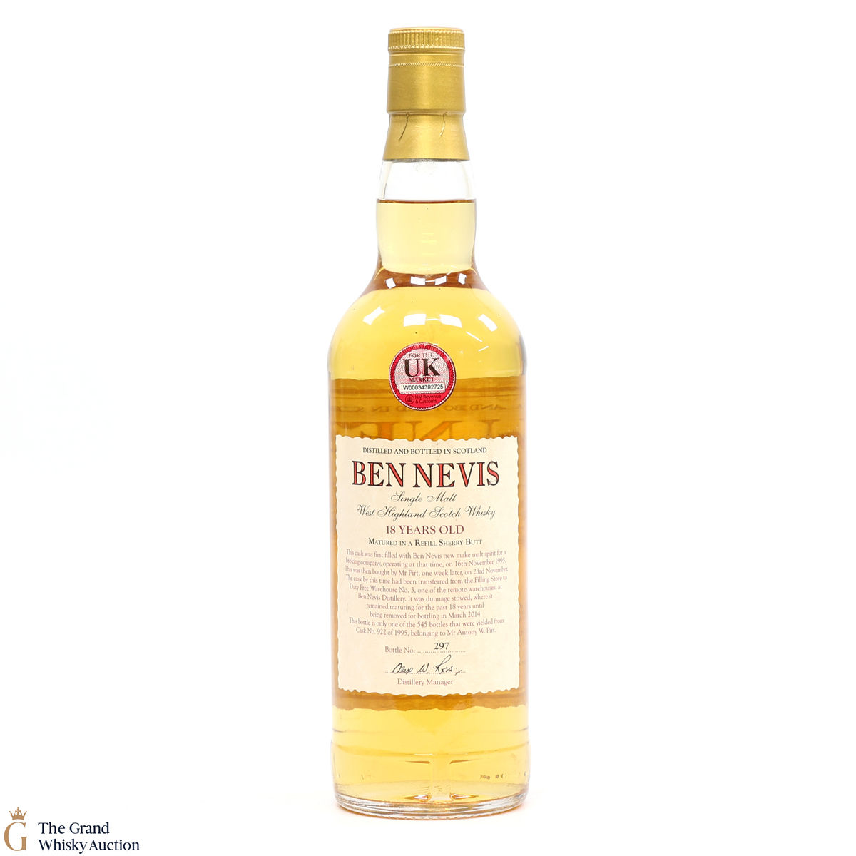 This single-cask malt whisky was distilled at Ben Nevis distillery on the 16th of November 1995. It has been aged for 18 years in a single refill sherry butt cask #922 and bottled in March 2014 exclusively for Antony Woodville Pirt.