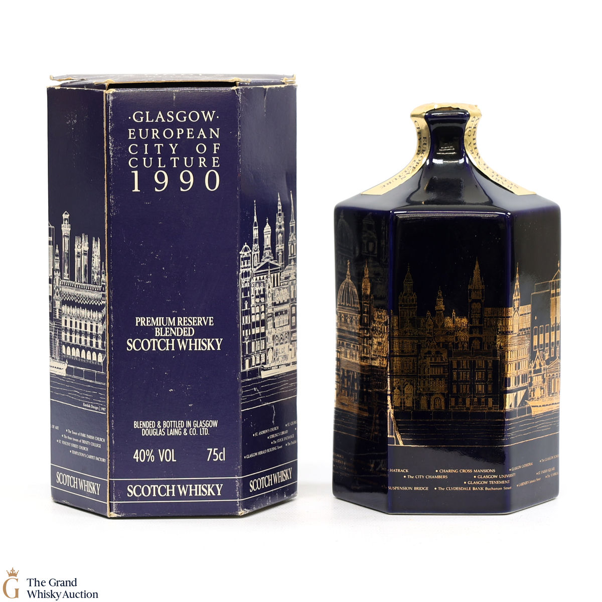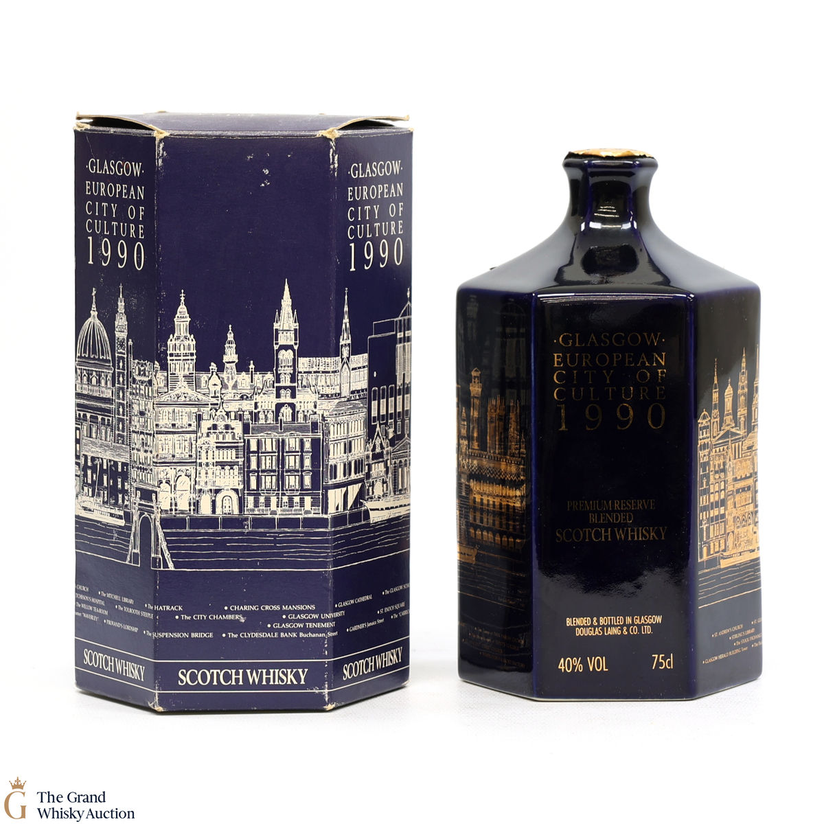 A very collectable decanter by Douglas Laing with illustrations of famous Glasgow landmarks in gold to celebrate Glasgow being bestowed the title of the European City of Culture in 1990.