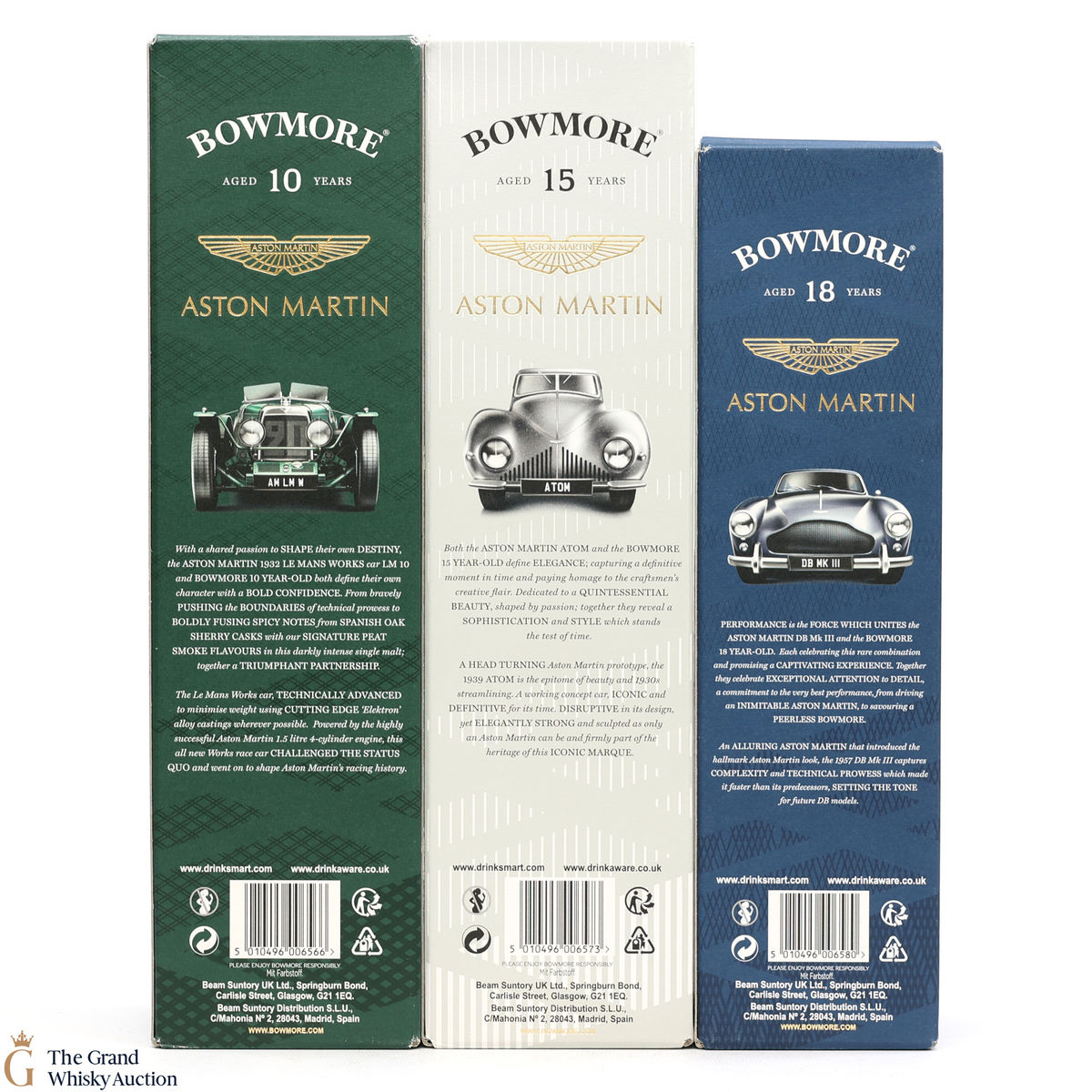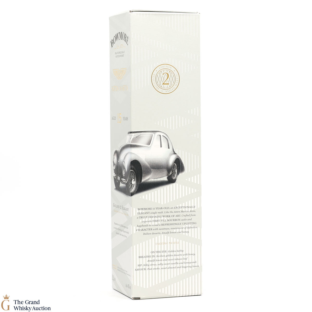 Bowmore - 15-Year-Old - Aston Martin Edition 2 (1L): Edition 2 of the Bowmore x Aston Martin collaboration celebrates the iconic Aston Martin 1939 Atom. A working concept car, iconic and definitive for its time. A great pairing for the golden and elegant 15-year-old, married in 1st fill bourbon casks to create a refreshing, silky peat-smoked character with notes of citrus. Bottled at 43% ABV.