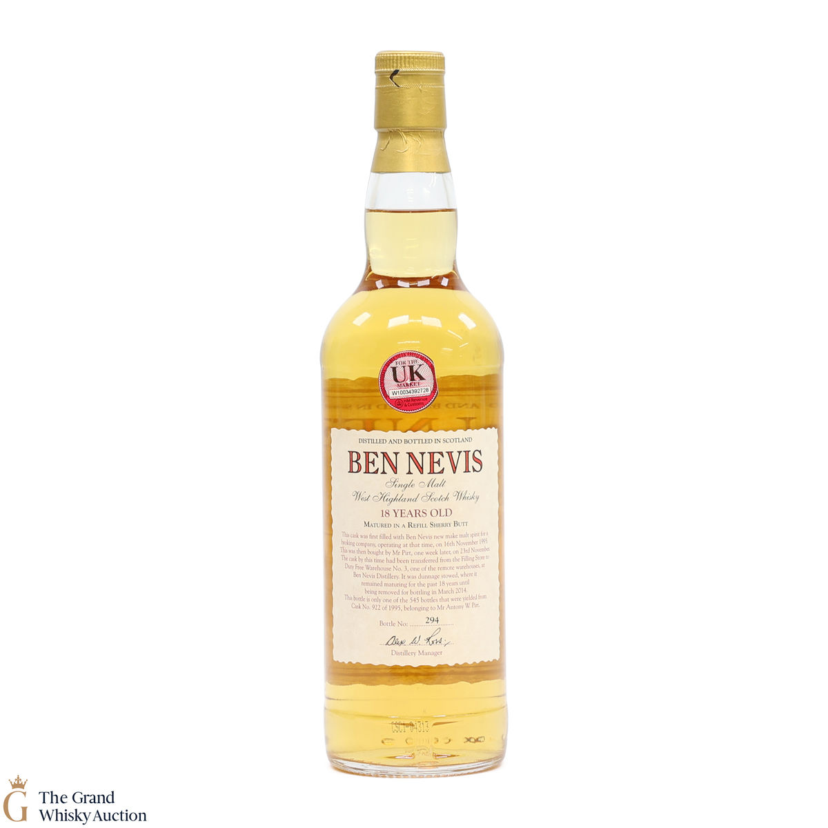 This single-cask malt whisky was distilled at Ben Nevis distillery on the 16th of November 1995. It has been aged for 18 years in a single refill sherry butt cask #922 and bottled in March 2014 exclusively for Antony Woodville Pirt.
