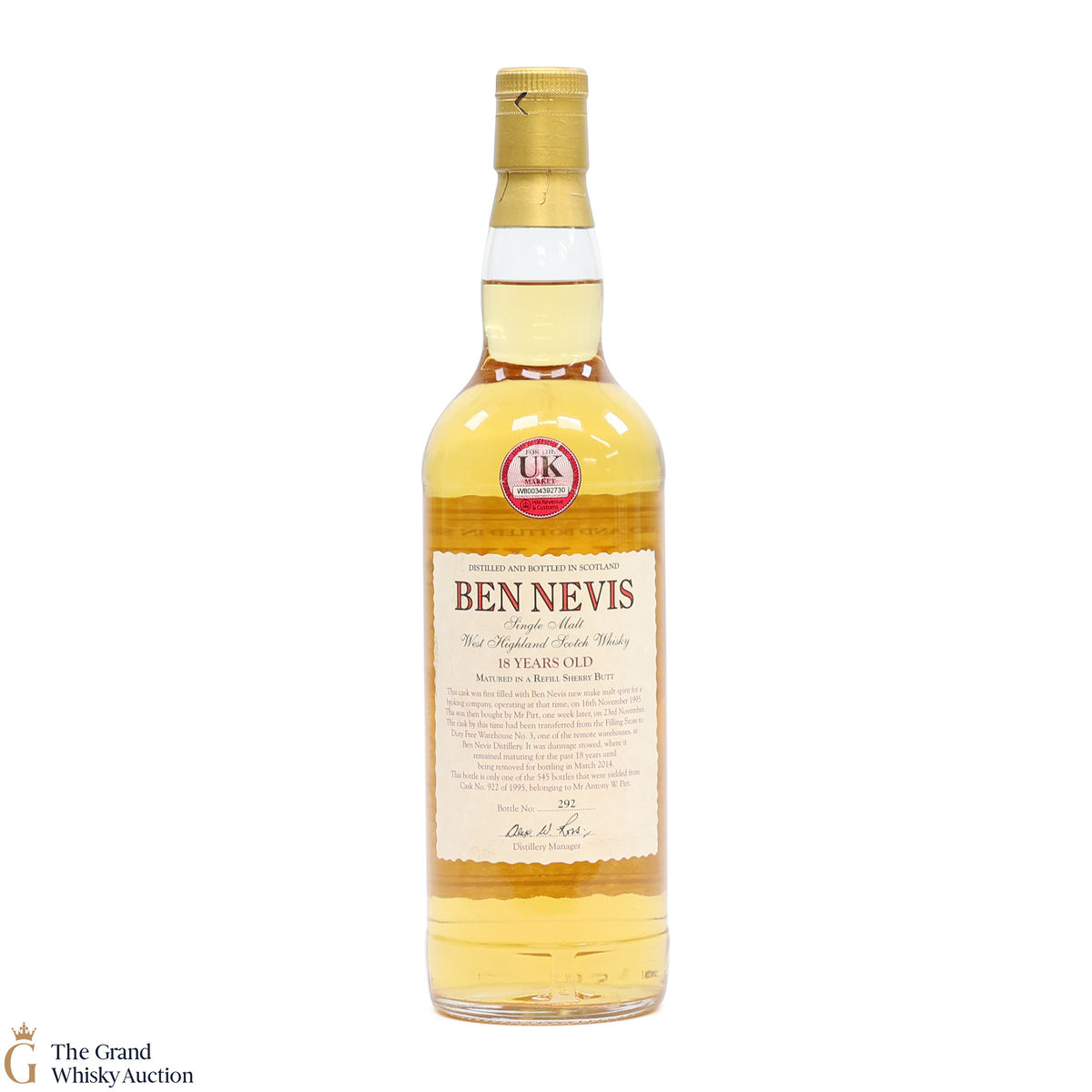 This single-cask malt whisky was distilled at Ben Nevis distillery on the 16th of November 1995. It has been aged for 18 years in a single refill sherry butt cask #922 and bottled in March 2014 exclusively for Antony Woodville Pirt.