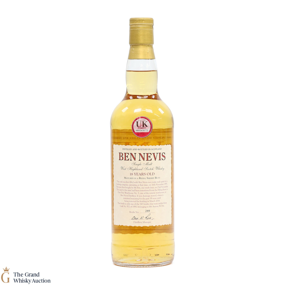 This single-cask malt whisky was distilled at Ben Nevis distillery on the 16th of November 1995. It has been aged for 18 years in a single refill sherry butt cask #922 and bottled in March 2014 exclusively for Antony Woodville Pirt.