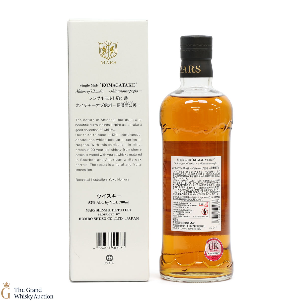 Their third release is Shinanotanpopo, dandelions which pop up in spring in Nagano. With this symbolism in mind, precious 20 year old whisky from sherry casks is vatted with young whisky mature in Bourbon and American white oak barrels. The result is a floral and fruity impression.