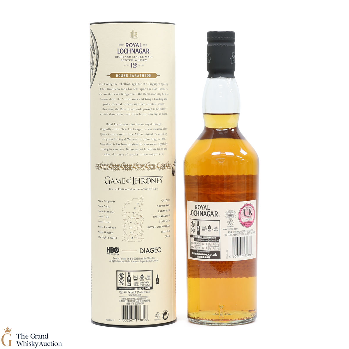 This is a limited-edition 12 year old single malt from Royal Lochnagar and it is part of Diagio's 2018 collaboration with HBO. Each single malt in the series relates to the land of houses of the Game of Thrones television series. The Royal Lochnagar bottle is decorated with a rampant black Stag, the sigil of House Baratheon that once flew on banners above the Stormlands and King’s Landing signifying absolute power.