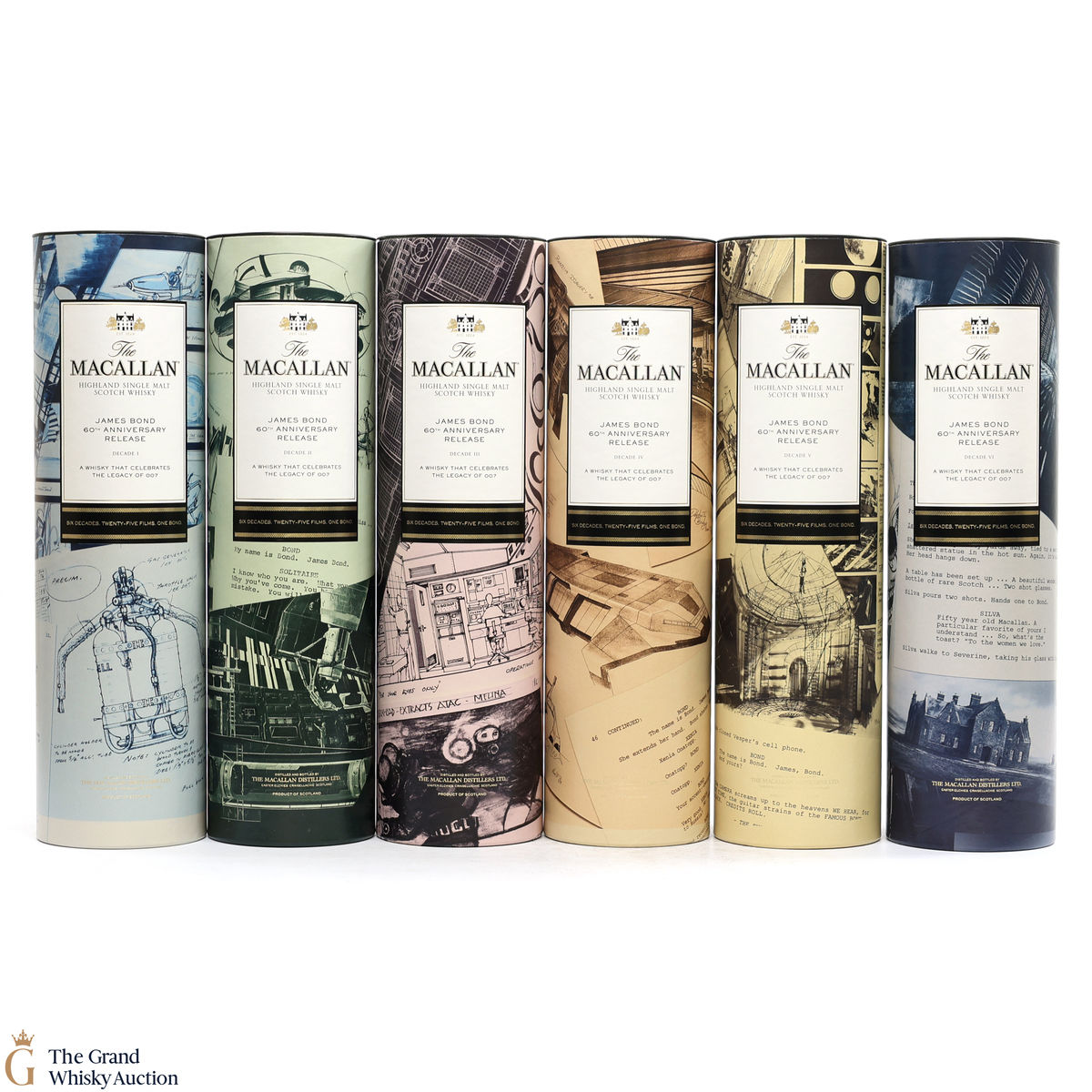 The remarkable James Bond 60th Anniversary Release is a celebration of 007 and The Macallan as modern innovators linked by their Scottish heritage. Each bottle’s packaging features an original illustrative design and colour to denote the decade it represents.