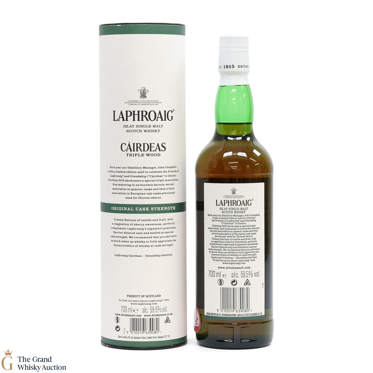 Cairdeas, Gaelic for 'friendship', is an annual bottle release by Laphroaig for their Friends of Laphroaig members. This Càirdeas Triple Wood Cask Strength was released for Fèis Ìle 2019. It has had a special triple maturation; first matured in ex-bourbon barrels, then in quarter casks, and finally in European oak casks which previously held oloroso sherry. Before being bottled at a cask strength of 59.5% ABV.