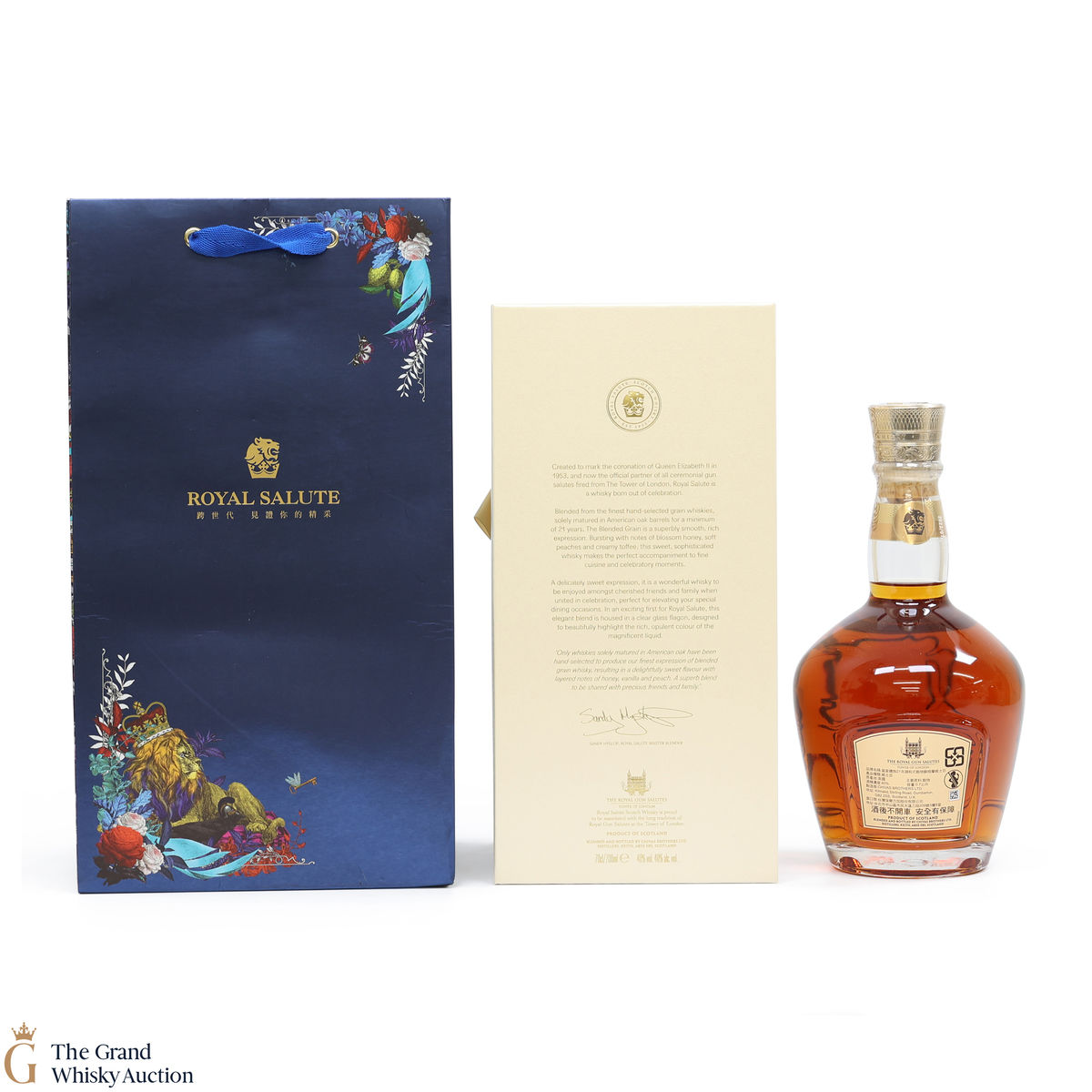 This Royal Salute 21-Year-Old is a blended grain whisky. Bottled at 40% ABV. This is the first Royal Salute to be bottled in a fully transparent flagon.