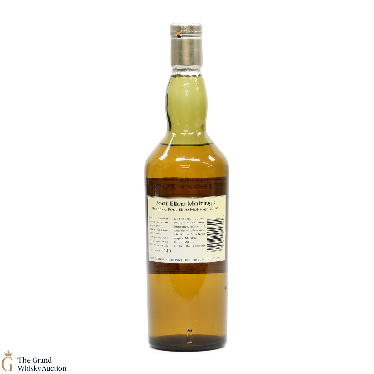 A rare and a stunning Port Ellen, bottled 1998 to commemorate the 25th Anniversary of Port Ellen Maltings. Rear label printed with the names of the distillery staff, 1998.