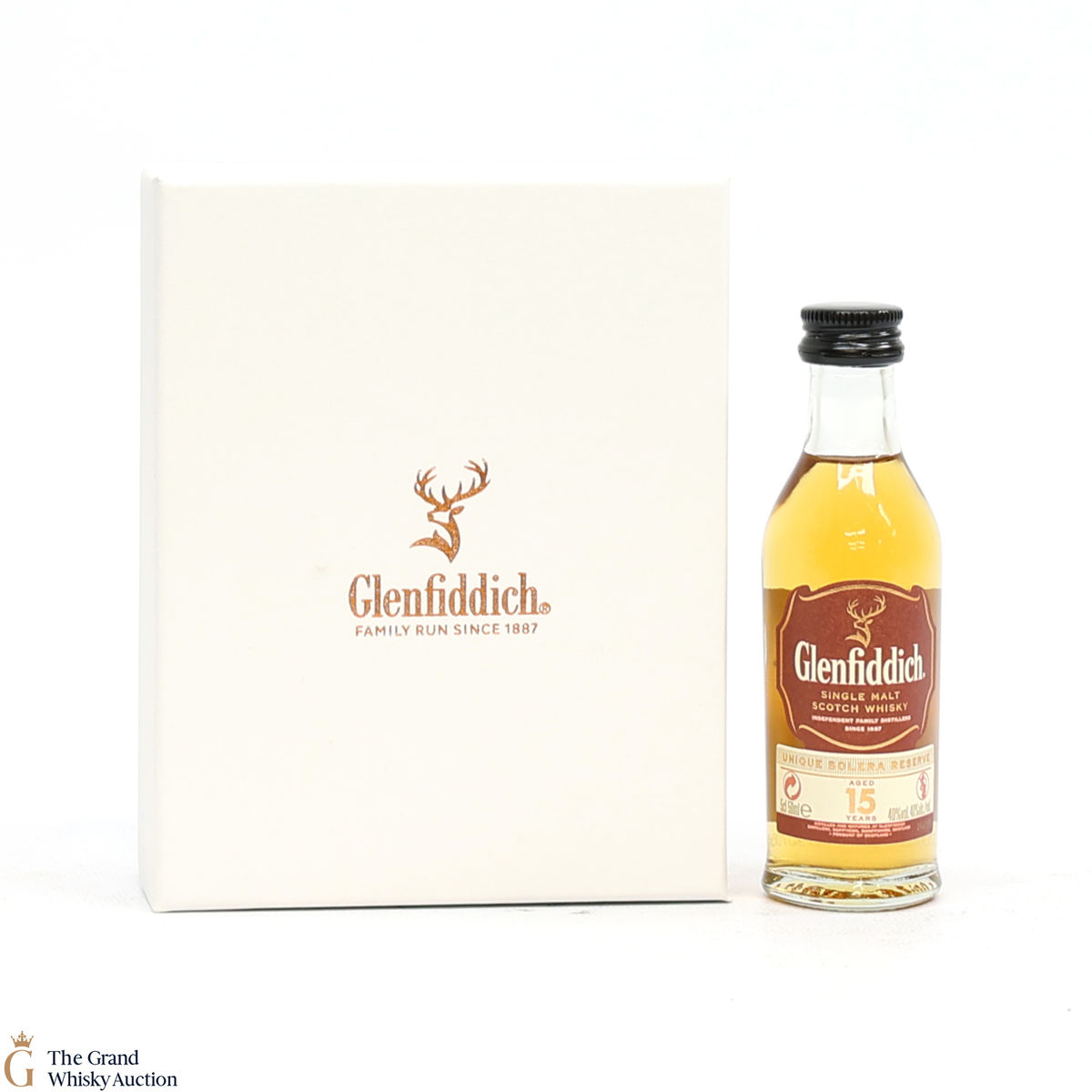 This lot includes a 5cl bottling of Glenfiddich 15 Year Old Unique Solera Reserve and a branded glass.