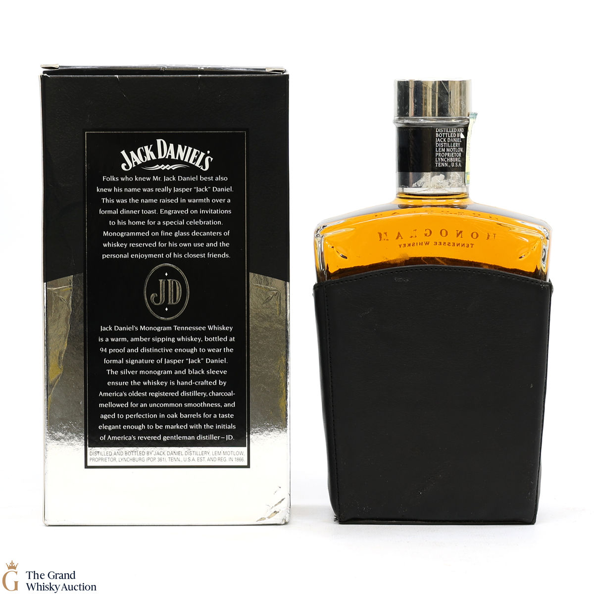 An unusually-shaped bottling of Jack Daniel's Monogram in a leather holder. This bottling was redesigned in 2004 for the Asian Market.