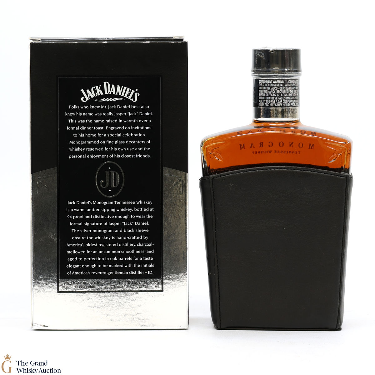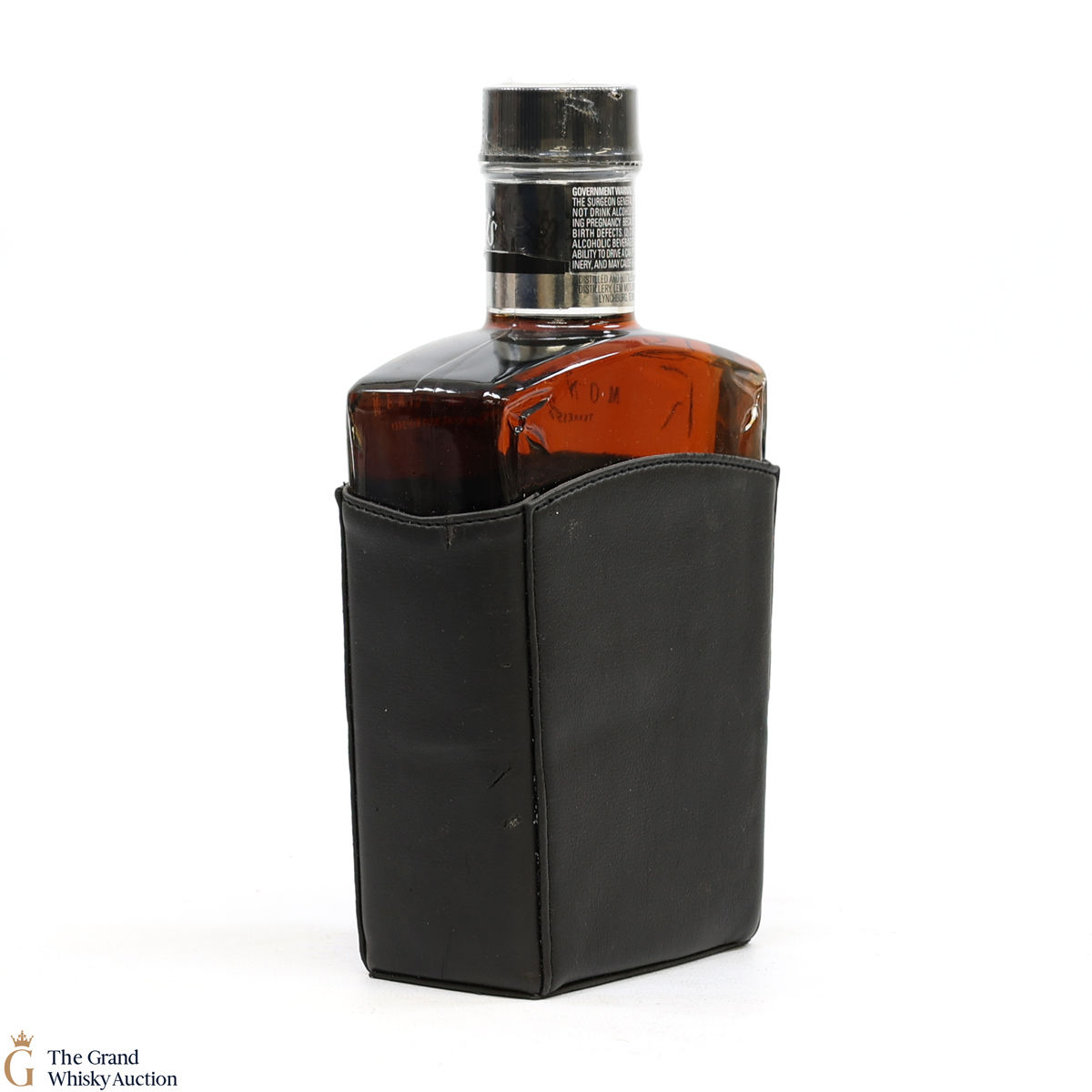 An unusually-shaped bottling of Jack Daniel's Monogram in a leather holder. This bottling was redesigned in 2004 for the Asian Market.