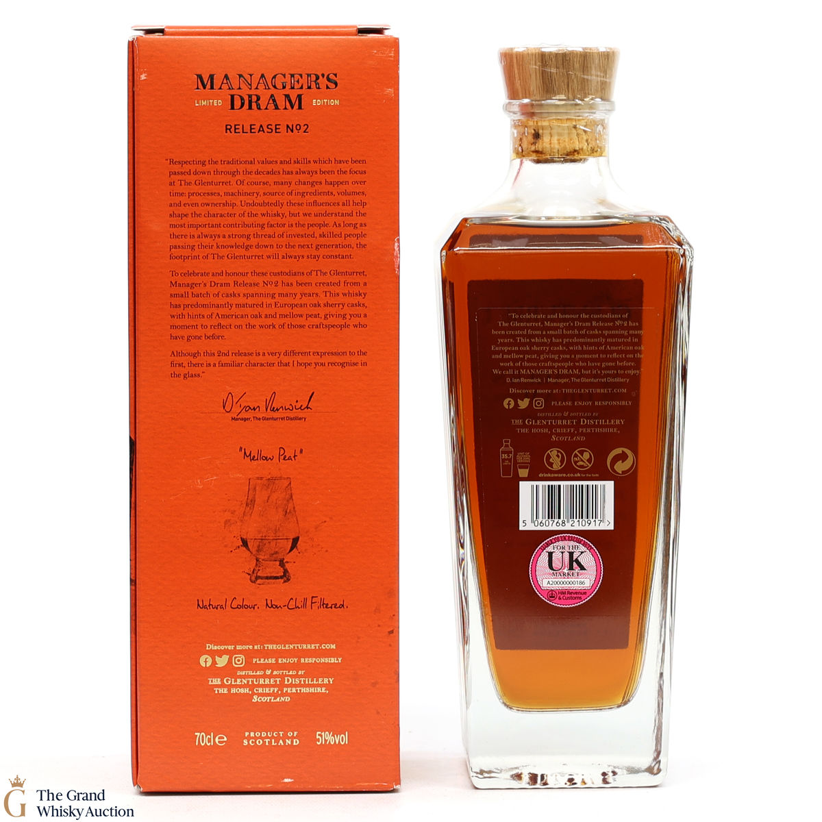 The Glenturret Manager's Dram - Release 2 described as mellow peat. Matured in European Sherry Driven in warehouse 9 before being bottled in 2022.