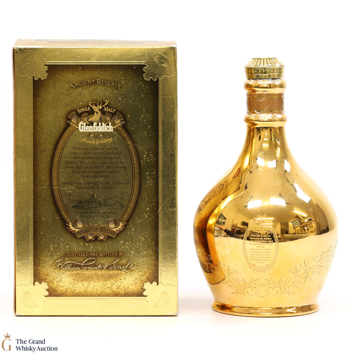 This beautiful golden decanter was produced by Spode and crafted with 23-carat gold gilded ceramic and filigree highlights. Filled with 18 Year Old Glenfiddich single malt.