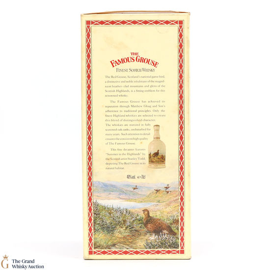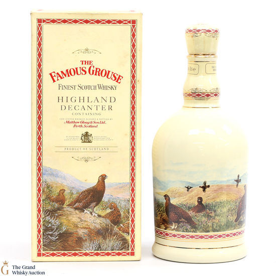 A bottle of Famous Grouse housed within a ceramic 'Highland' decanter. First blended by Matthew Gloag & Son in 1896, as of 2013, it has been the highest selling brand of whisky in Scotland since 1980.