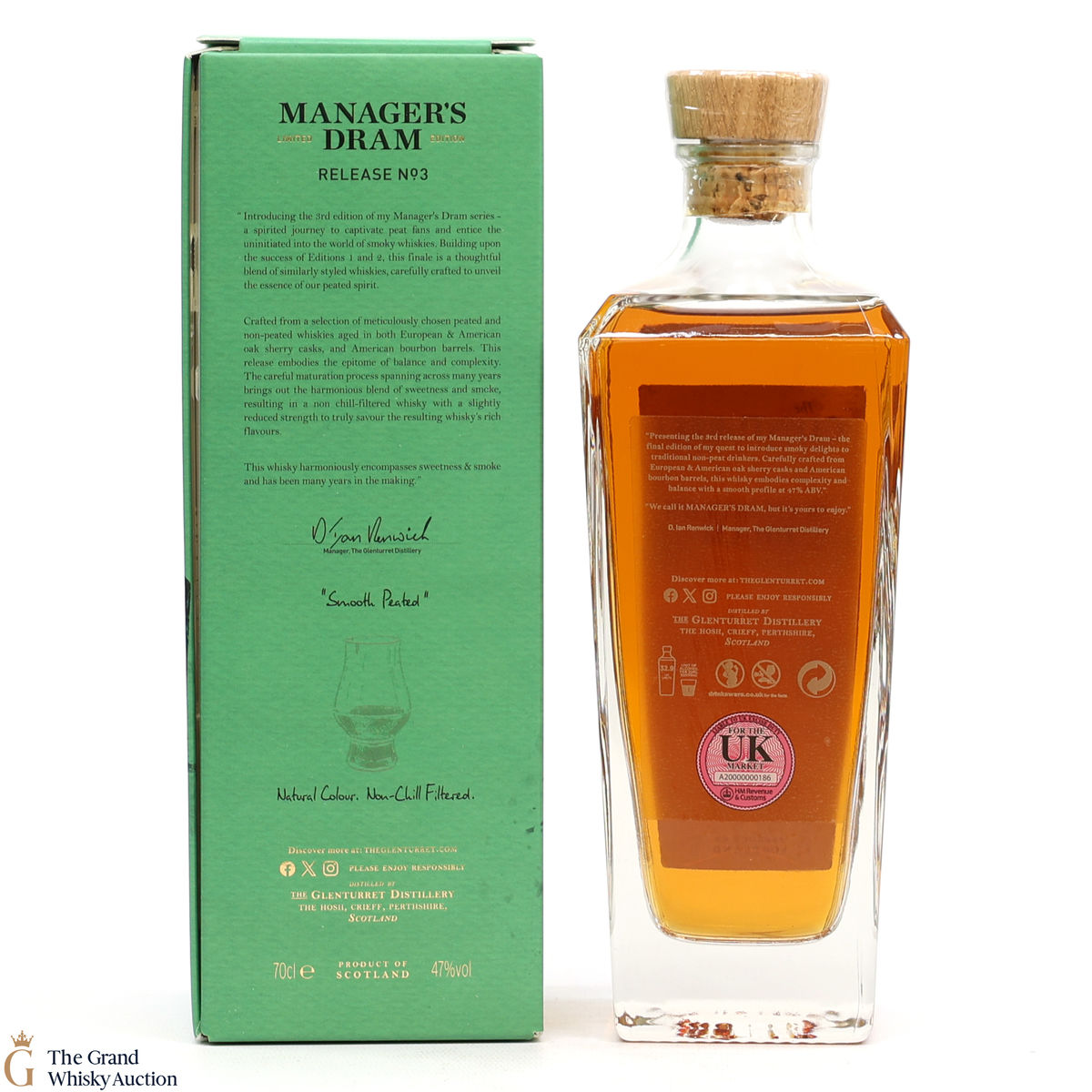 The Glenturret Manager's Dram - Release 3 is described as smooth peated and matured in Ex-Bourbon & Sherry casks before being bottled in 2023.