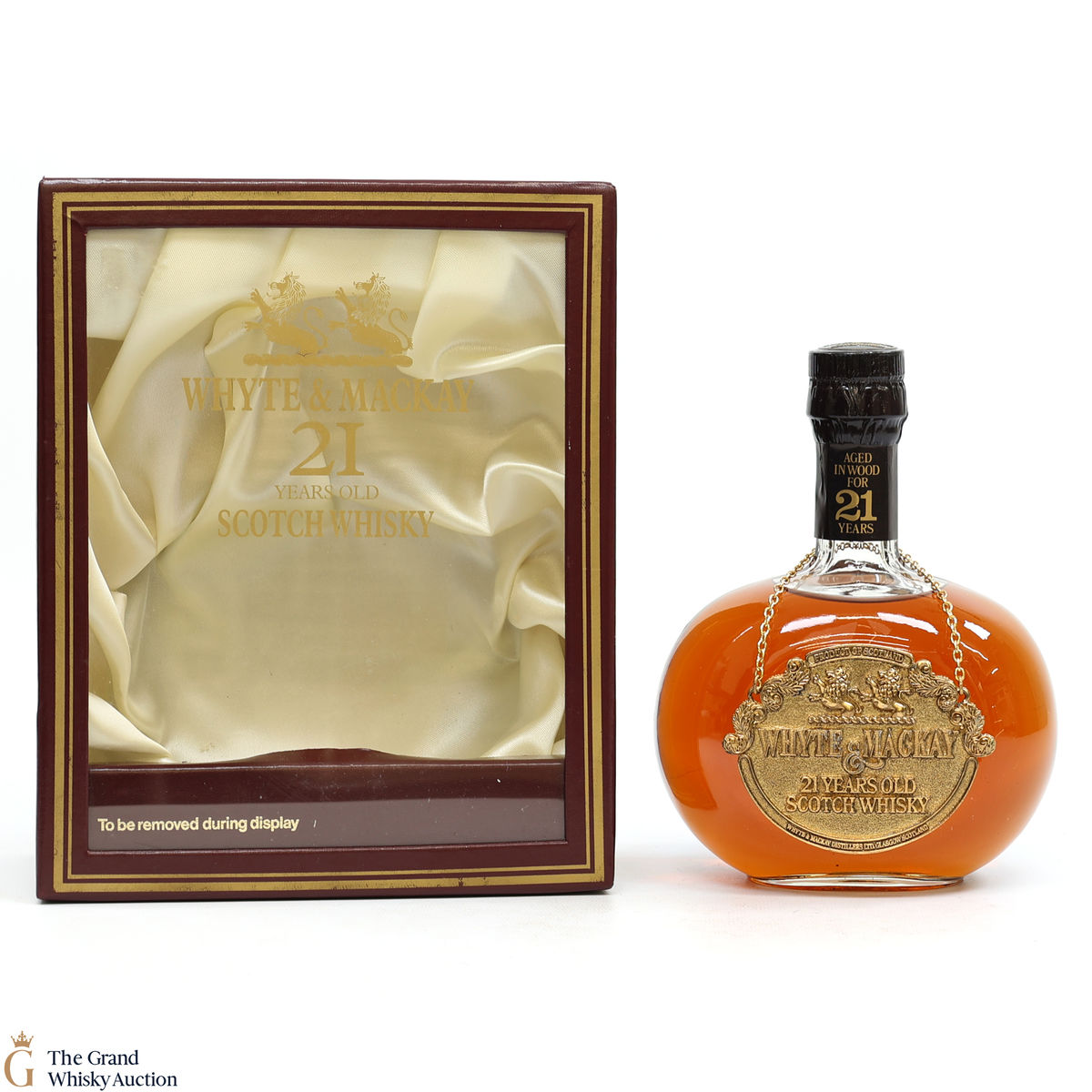 This is a very nicely presented bottle of 21-year-old blended whisky from Whyte & Mackay, which is believed to be produced in the 1980's. The bottle comes with a metallic tag that hangs from the neck of the decanter. It also comes in a beautiful silky lined presentation box.