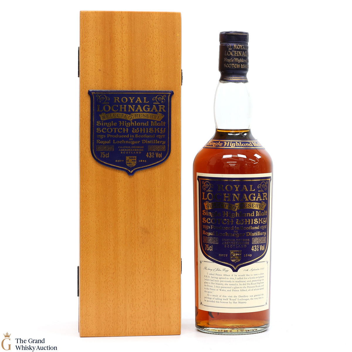 Royal Lochnagar Select Reserve is presented in a wooden case that is lined with a royal blue colour.