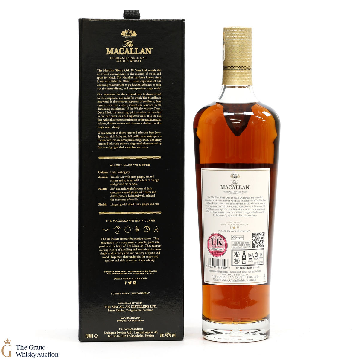 This annual release of The Macallan's popular 18-year-old Sherry Oak is matured exclusively in sherry-seasoned casks, built from both Spanish and American oak, providing a beautifully dark flavour with rich aromas.