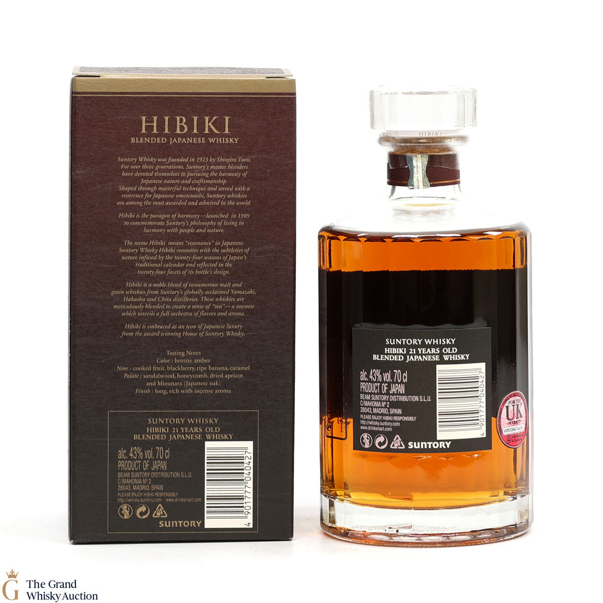 Hibiki 21 Year Old is a very popular blended whisky from Suntory. It is made up of a blend of specially selected mature malt and grain whiskies aged over 21 years. The key Yamazaki sherry casked malt is vatted with other carefully chosen mellow unblended grain whiskies over 21 years old.