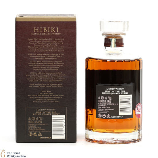 Hibiki 21 Year Old is a very popular blended whisky from Suntory. It is made up of a blend of specially selected mature malt and grain whiskies aged over 21 years. The key Yamazaki sherry casked malt is vatted with other carefully chosen mellow unblended grain whiskies over 21 years old.