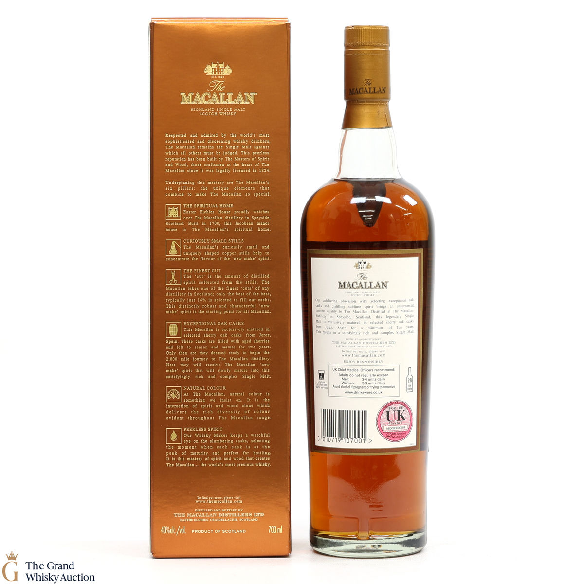 Distilled at the world-renowned Macallan Distillery in Speyside, this single malt was matured exclusively in sherry oak casks from Jerez, Spain. It was aged for a total of 10 years prior to bottling at a strength of 40% ABV.