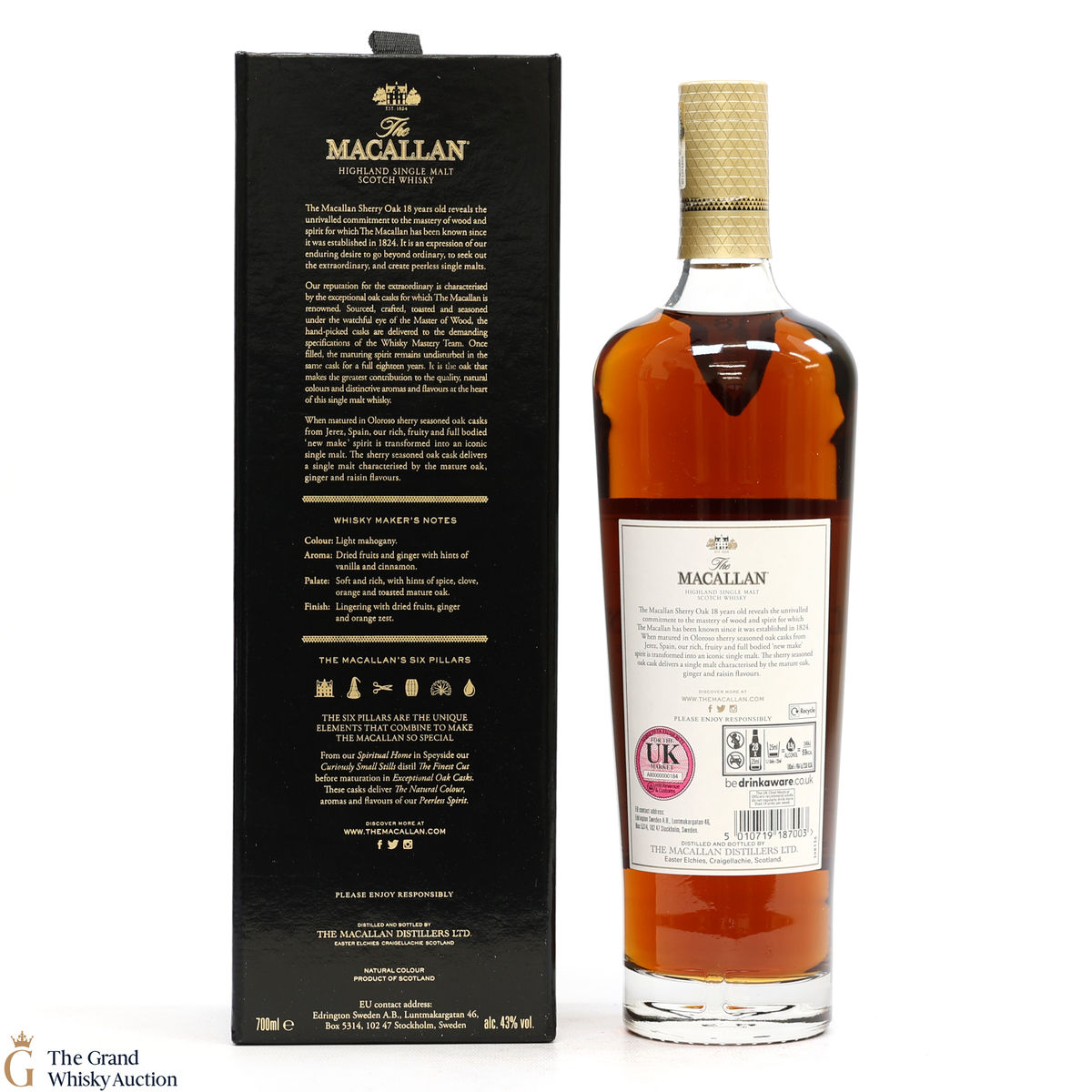This annual release of The Macallan's popular 18 Year Old Sherry Oak is matured exclusively in sherry seasoned casks, built from both Spanish and American oak, providing a beautifully dark flavour with rich aromas.