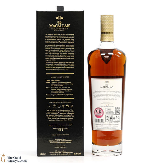 This annual release of The Macallan's popular 18-year-old Sherry Oak is matured exclusively in sherry-seasoned casks, built from both Spanish and American oak, providing a beautifully dark flavour with rich aromas.