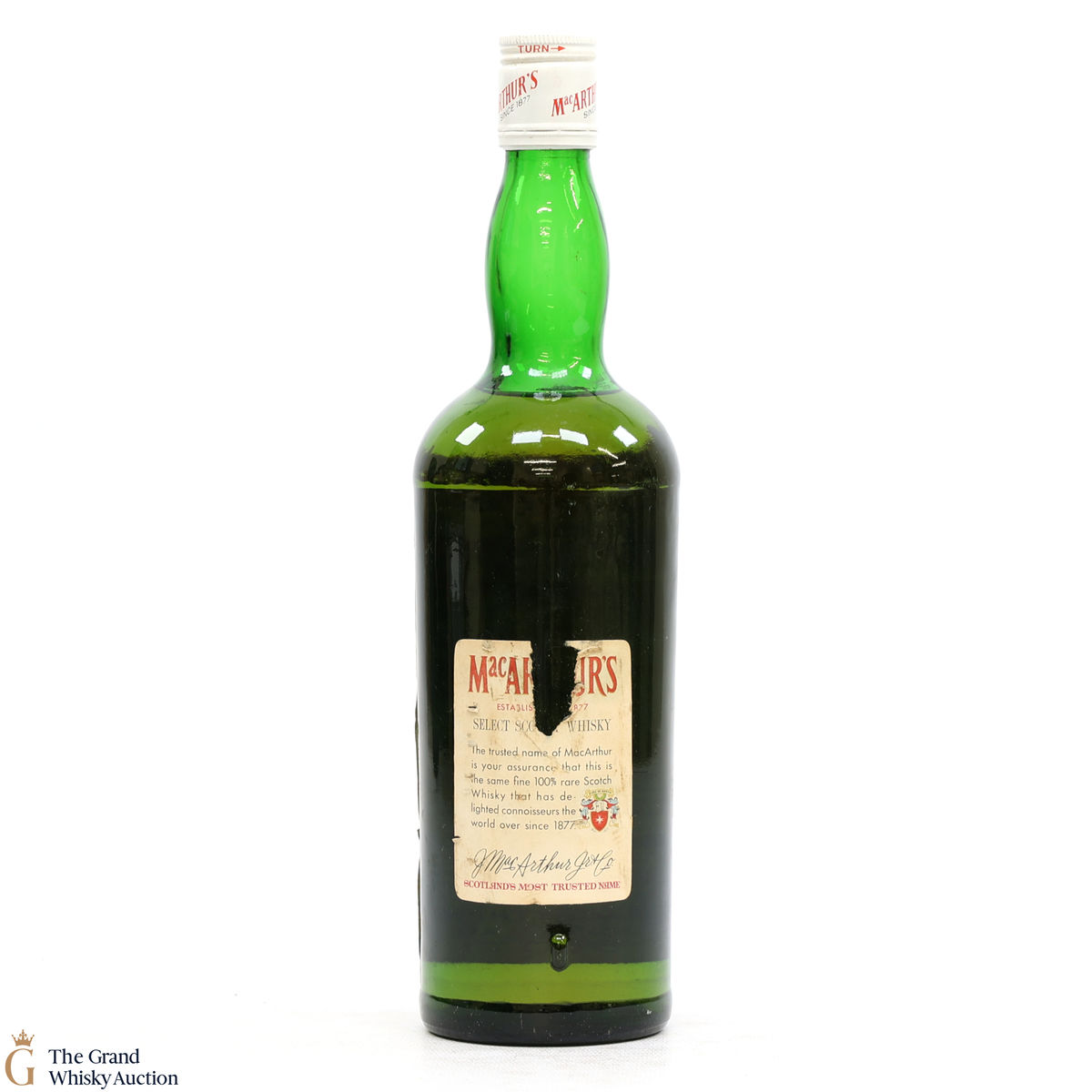 A bottle of MacArthur's Select blended Scotch whisky, produced in the 1970s. It as distilled, blended and bottled by J MacAurthur Jr & Co. It was bottled at 70 proof (40% ABV) and 26 2/3 FL. OZ. (approx. 76cl).