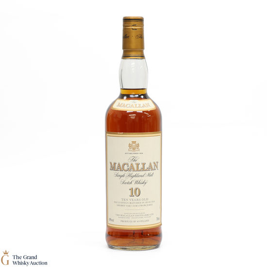An old bottling of Macallan 10-year-old, which has been exclusively matured in sherry oak casks. Bottled in the early 2000s.